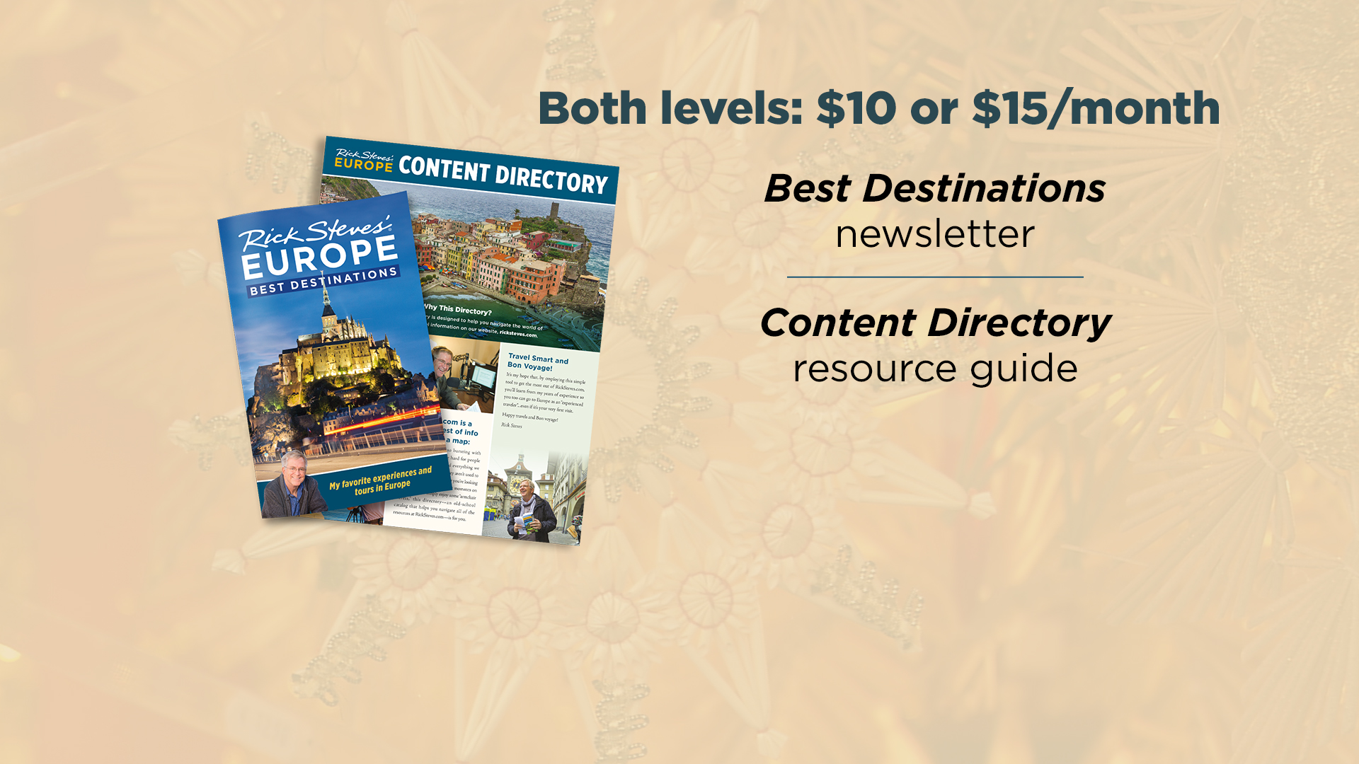 - "Rick Steves' Best Destinations" travel newsletter: 64 pages of stories, color photos, and graphics of Rick's top itineraries in Europe.